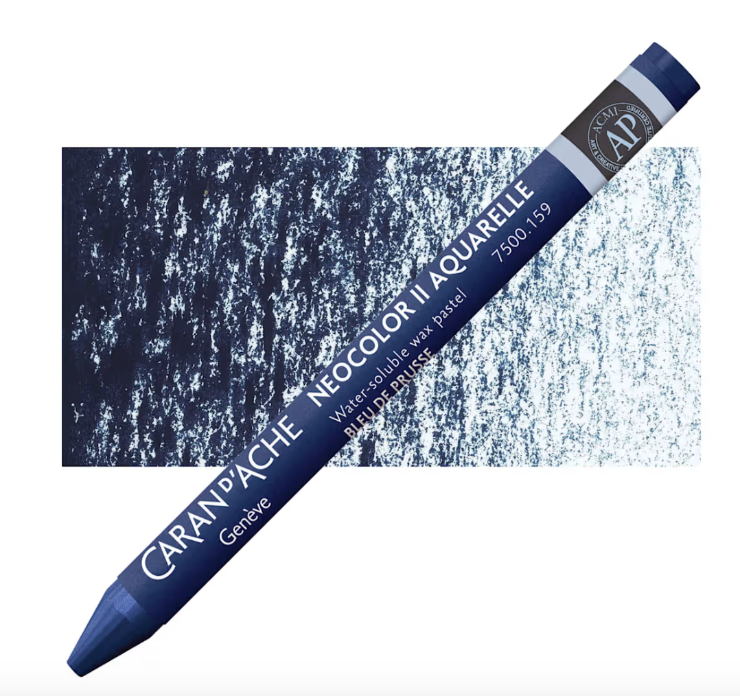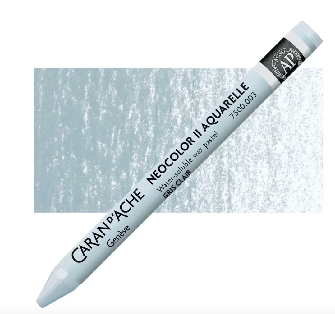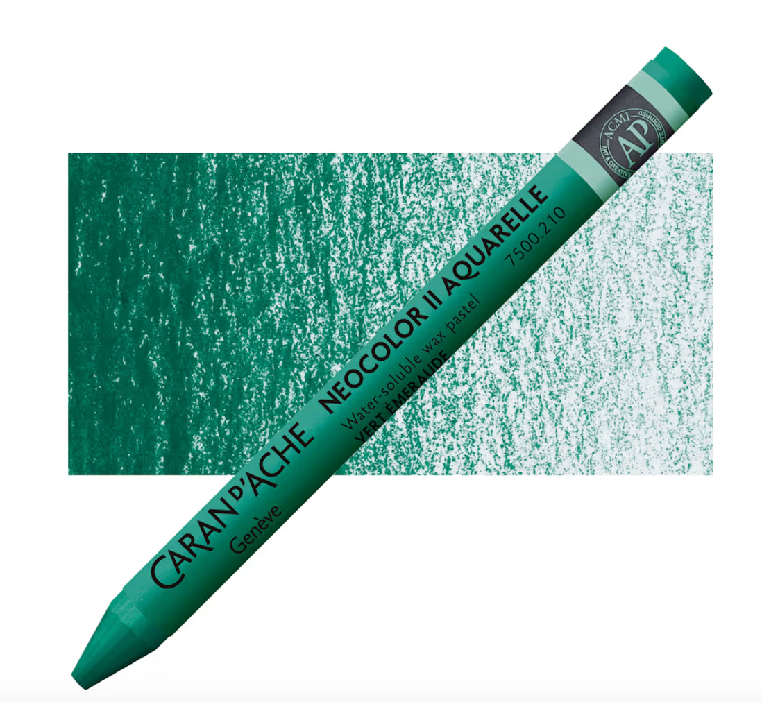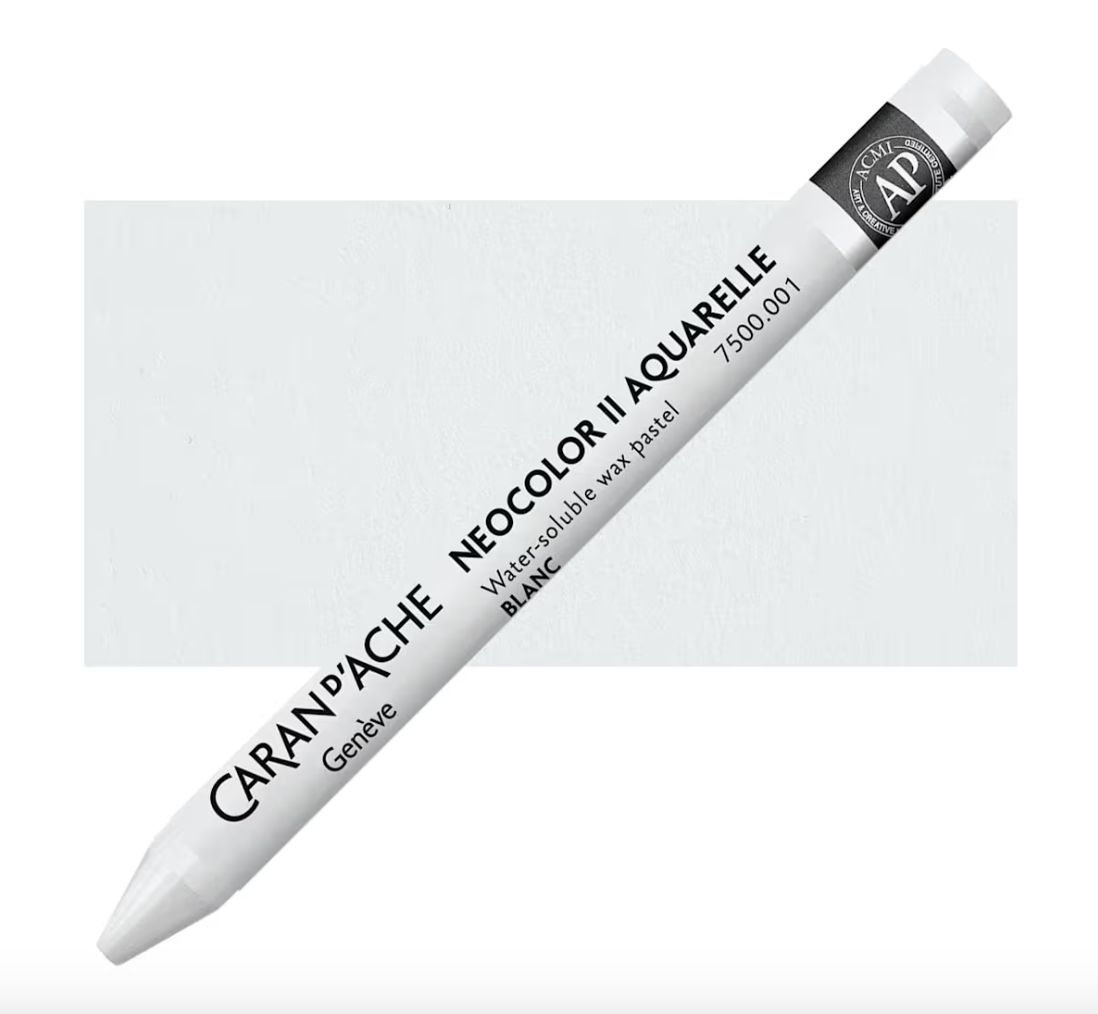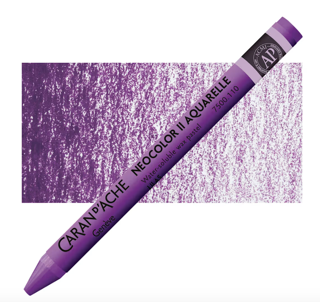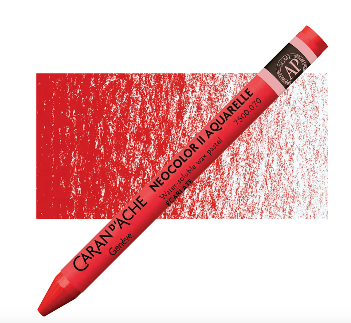 Caran d’Ache products are globally acknowledged for high quality pigments and excellent lightfastness. Caran d’Ache Neocolor II Aquarelle Artists’ Water-Soluble Wax Pastels are softer than colored pencils, creamier than children’s wax pastels, and tremendously responsive to a wet brush. The Neocolor II Wax Pastels allow you to combine wet and dry techniques in the same composition. Because of their strong pigmentation, light colors cov]er dark colors and vice-versa. This wonderful medium may be used alone or with a combination of other media!