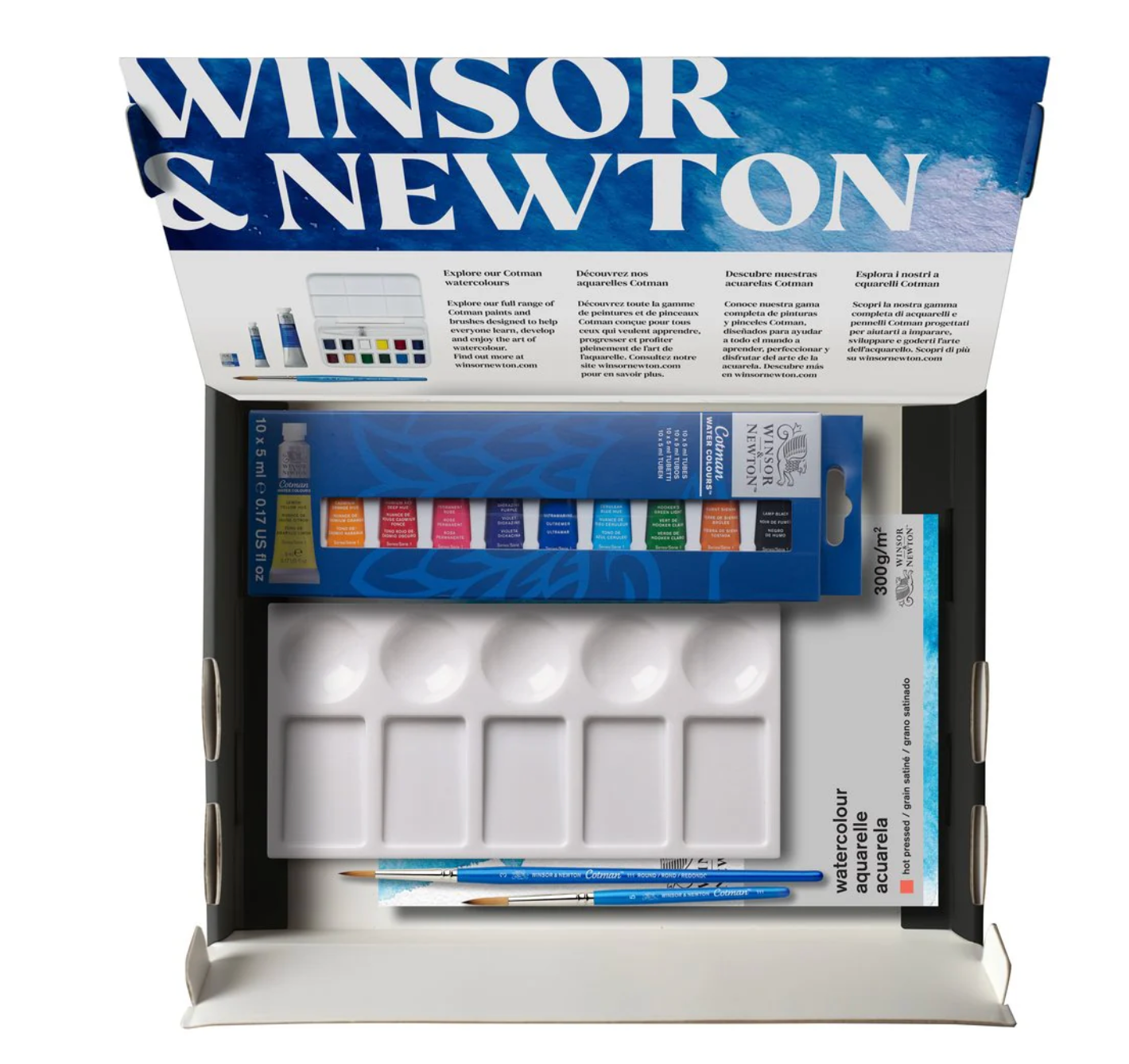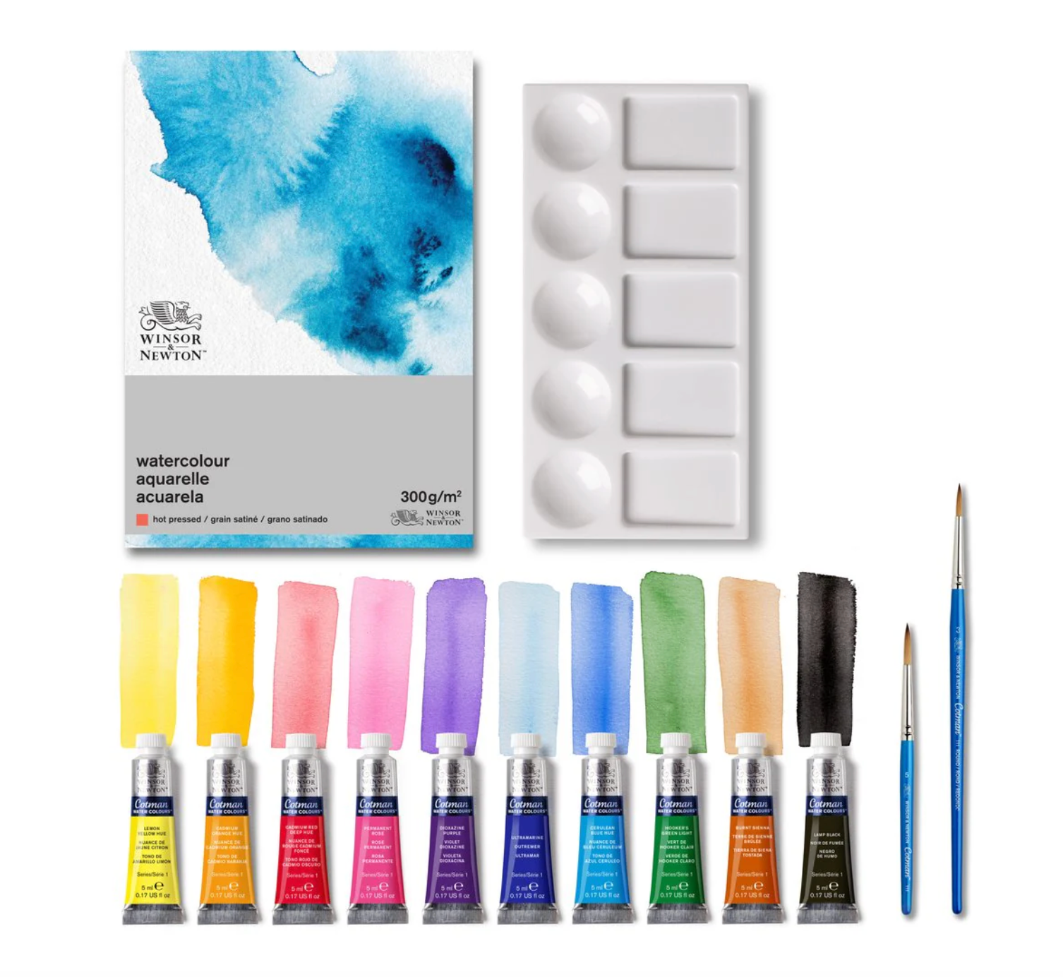 1 each of the following Cotman Watercolour 5ml tubes: Lemon Yellow Hue Cadmium Orange Hue Cadmium Red Deep Hue Permanent Rose Dioxazine Purple Ultramarine Cerulean Blue Hue Hooker’s Green Light Burnt Sienna Lamp Black Plus… Cotman Brush Series 111 , RD SH - Size 3 Cotman Brush Series 111 , RD Travel Size - Size 5 Winsor & Newton WC Paper Cold Press Pad: Size 7 x 10in / 17.8 x 25.4 cm 12 Sheets, 300g/m2 140lbs Acid-free Plastic Palette – 5 round wells & 5 slanted wells
