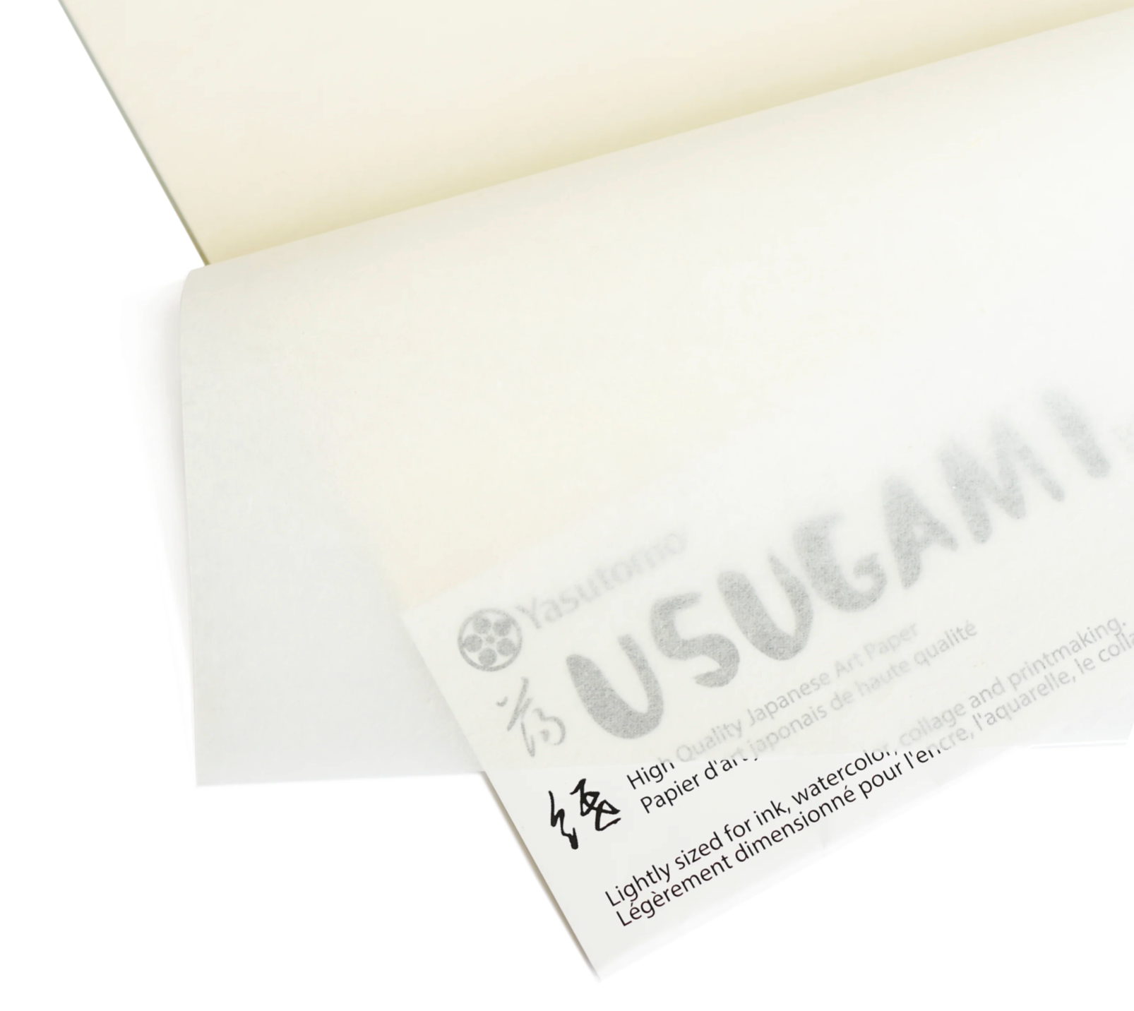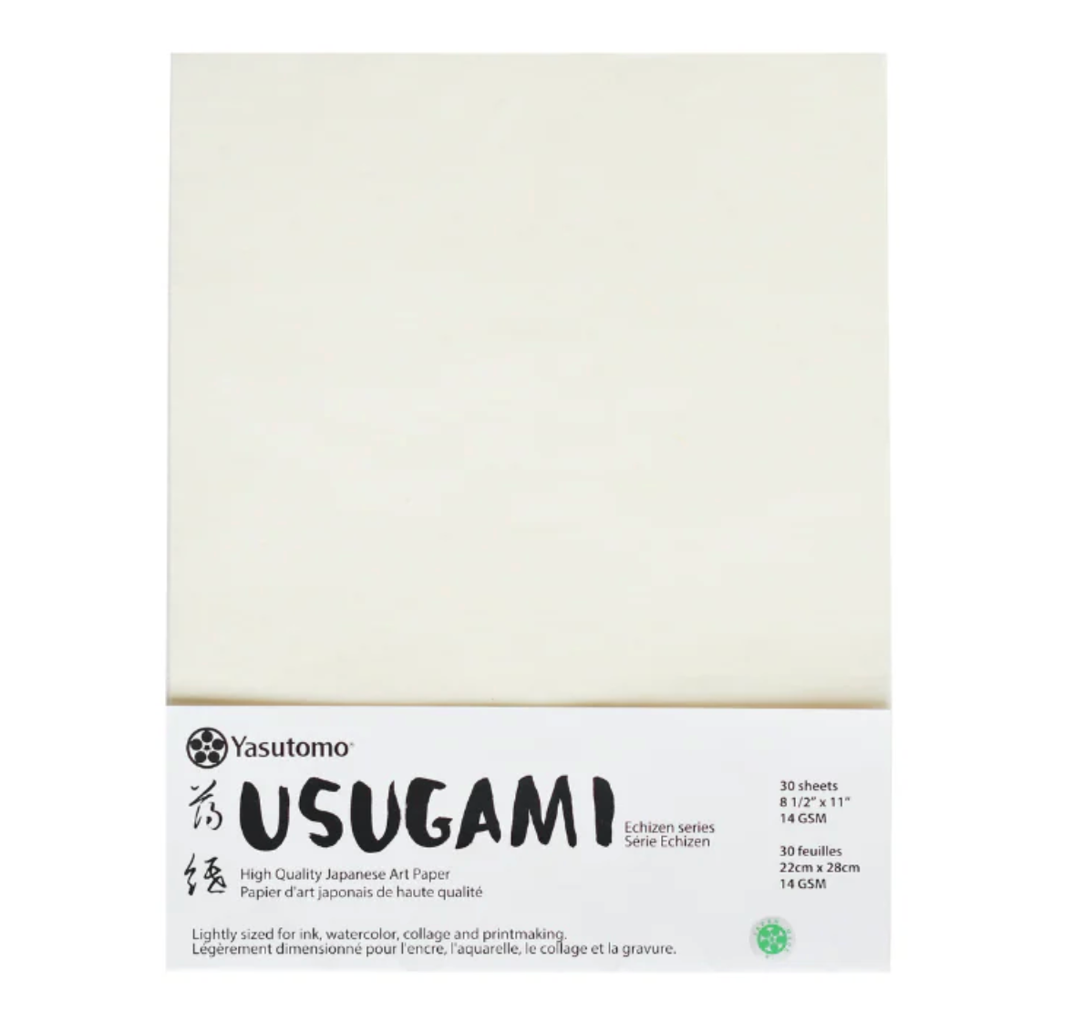 Usugami is a strong, translucent tissue paper made in the Ehime prefecture of Japan. It is sized to allow for finer detail in ink, watercolor, monoprintmaking and laser printing.