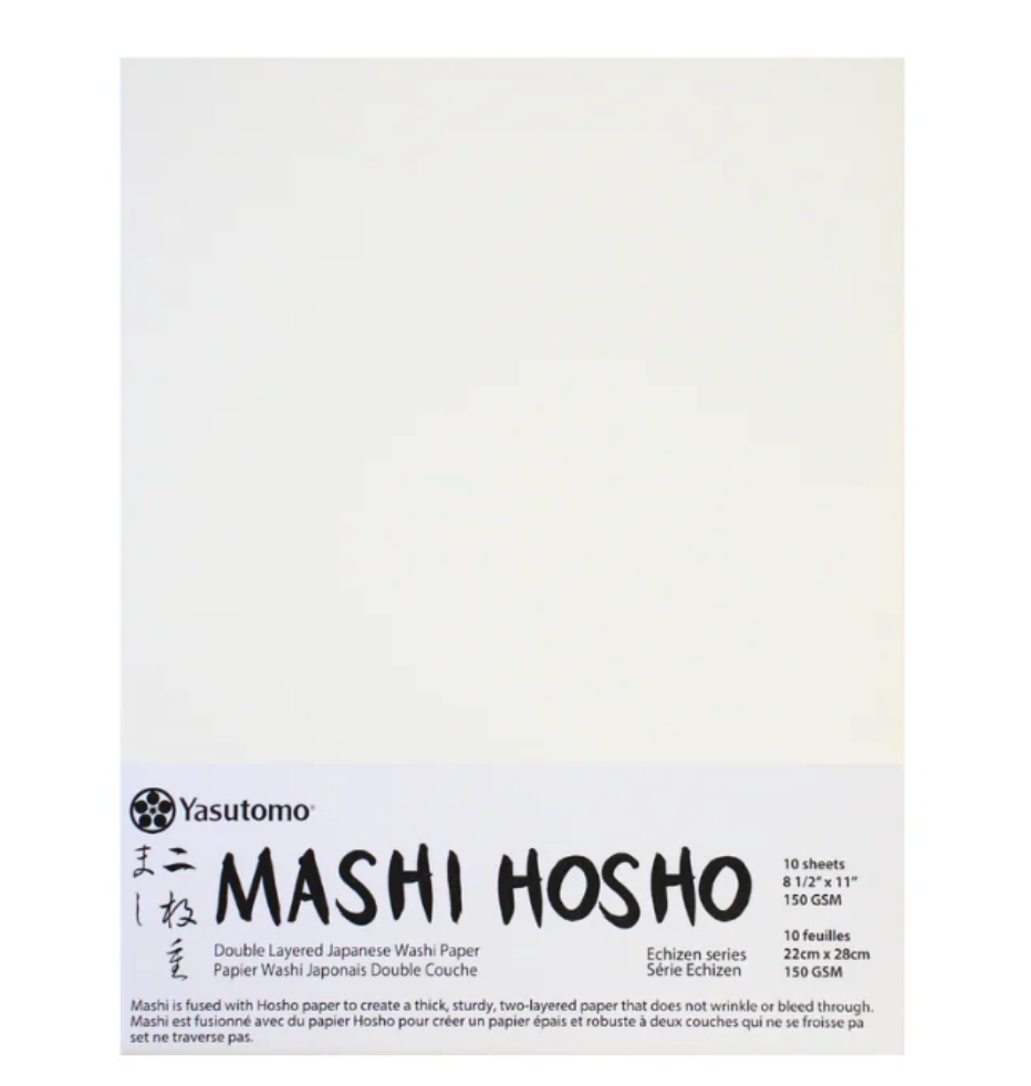 Smooth Mashi paper is fused with sturdy Hosho paper on the back side, producing a thick, sturdy paper that accepts mediums beautifully on both sides.