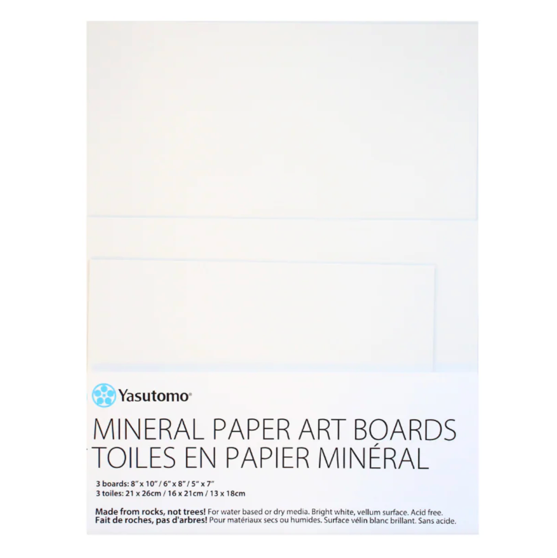 What is Mineral Paper? Mineral Paper is a paper substrate made of calcium carbonate. It is not made of trees and does not contain any wood pulp. Mineral Paper provides a smooth, vellum surface with a delicate eggshell texture. Suitable for a variety of wet and dry mediums. Excellent for alcohol inks and silverpoint (no gesso preparation needed!) Not recommended for use with oil-based mediums.
