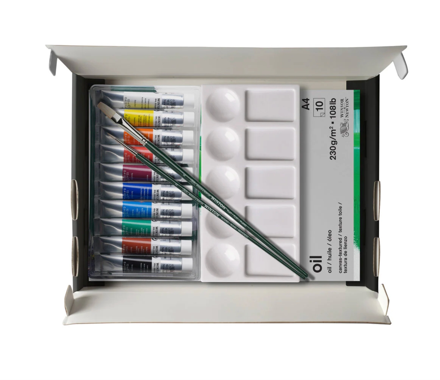 1 each of the following Winton Oil Colour 12ml tubes: Titanium White Cadmium Lemon Hue Cadmium Red Deep Magenta French Ultramarine Cerulean Blue Hue Viridian Hue Burnt Sienna Lamp Black Plus… Winton Hog Oil Brush, Round LH- Size 2 Winton Hog Oil Brush, Bright LH - Size 6 Winsor & Newton Canvas Textured Oil Pad: Size A4 (8.27 x 11.69in) 10 Sheets, 230g/m2 108lbs Acid-free Plastic Palette – 5 round wells & 5 slanted wells